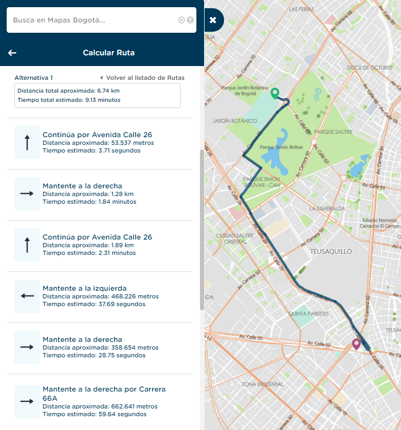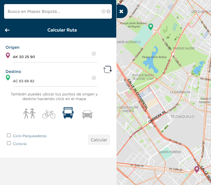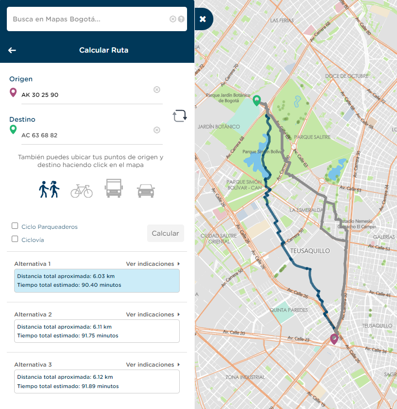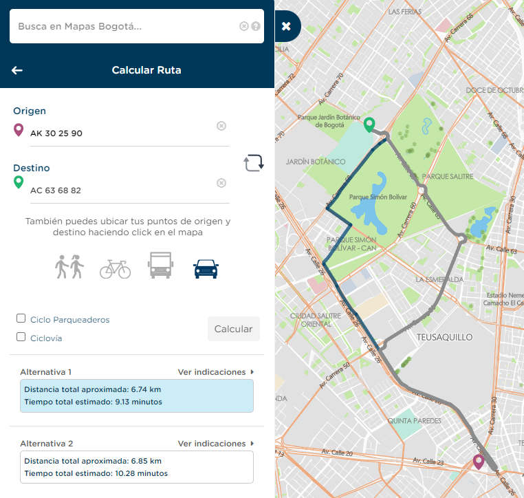 Mapas Bogotá te ofrece los siguientes medios de transporte: caminando, bicicleta, vehículo particular y transporte público. <img src="https://1335336016-files.gitbook.io/~/files/v0/b/gitbook-legacy-files/o/assets%2F-L9QwvrdZBRtQt9kMp-o%2F-M73hUm9V7J3mRXkiUJ8%2F-M73rErRP7Un_htohQDR%2Fimgmb59.png?alt=media&#x26;token=76c584b0-8f11-497d-aa5e-30ff3149b206" alt="" data-size="original">&#x20;
