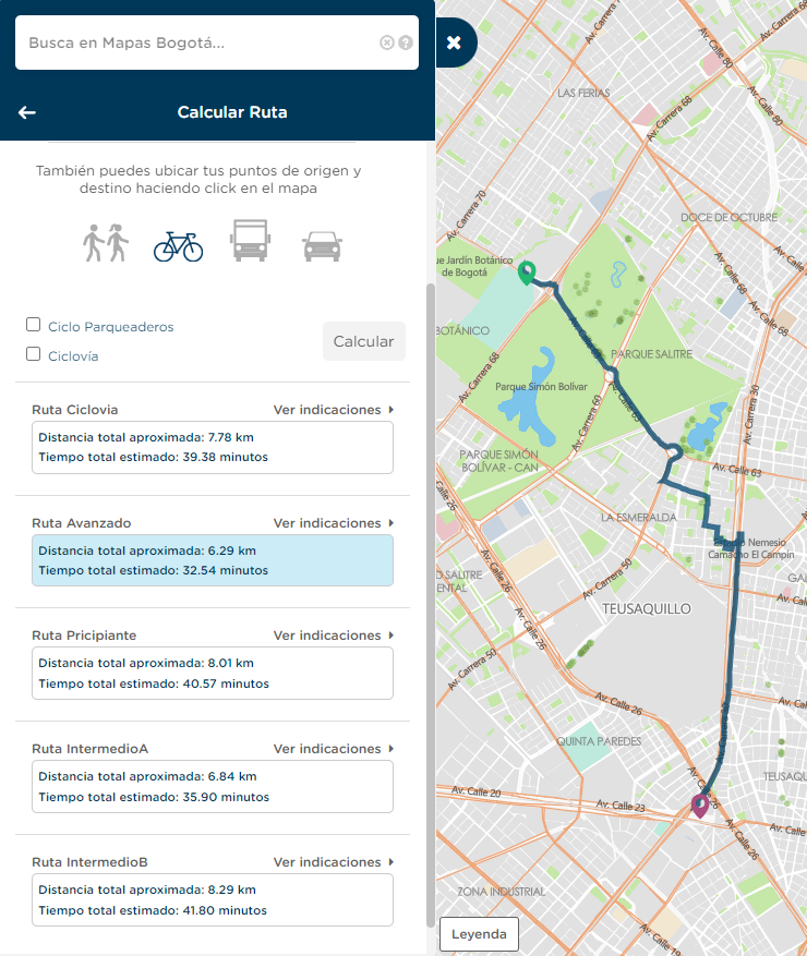 **4.Calcula la ruta:** Puedes calcular la ruta dando clic sobre uno de los medios de transporte disponibles <img src="https://1335336016-files.gitbook.io/~/files/v0/b/gitbook-legacy-files/o/assets%2F-L9QwvrdZBRtQt9kMp-o%2F-M73hUm9V7J3mRXkiUJ8%2F-M73rErRP7Un_htohQDR%2Fimgmb59.png?alt=media&#x26;token=76c584b0-8f11-497d-aa5e-30ff3149b206" alt="" data-size="original"> (La Bicicleta es el medio predeterminado) y luego en el botón "calcular" .&#x20;